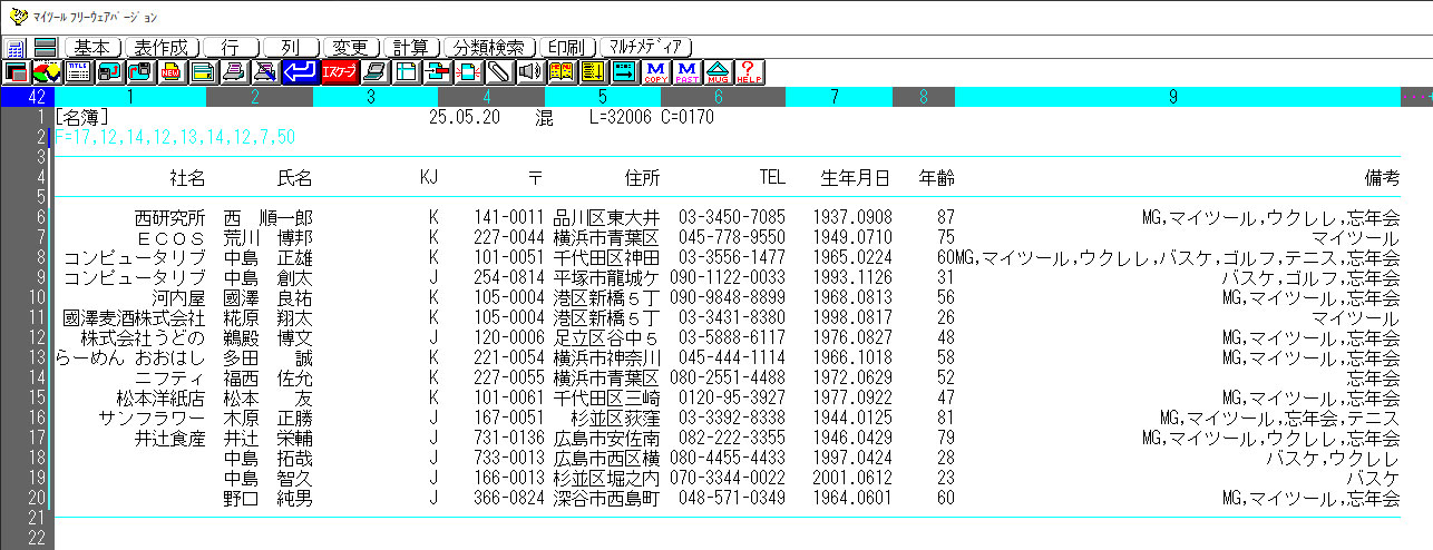 たとえば、ICドンで「個人か会社か」というカラム(列)をひとつ追加し、個人なら「J」、会社なら「K」と値を入れておけば、会社関係の名簿だけを見たいときは、SHドン「K」ドンで簡単に抽出できます。これが“マイツール的”な発想です。