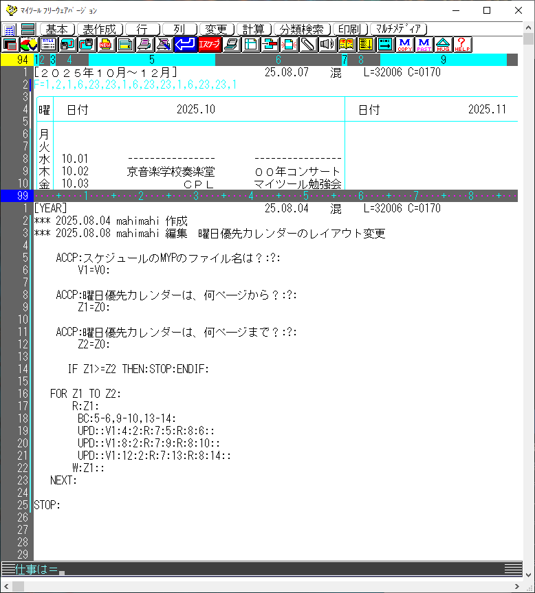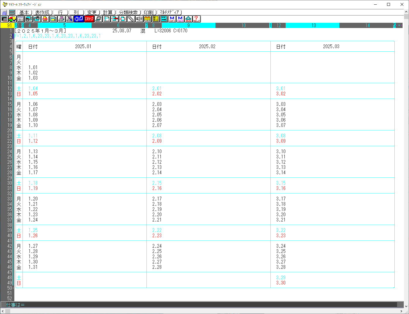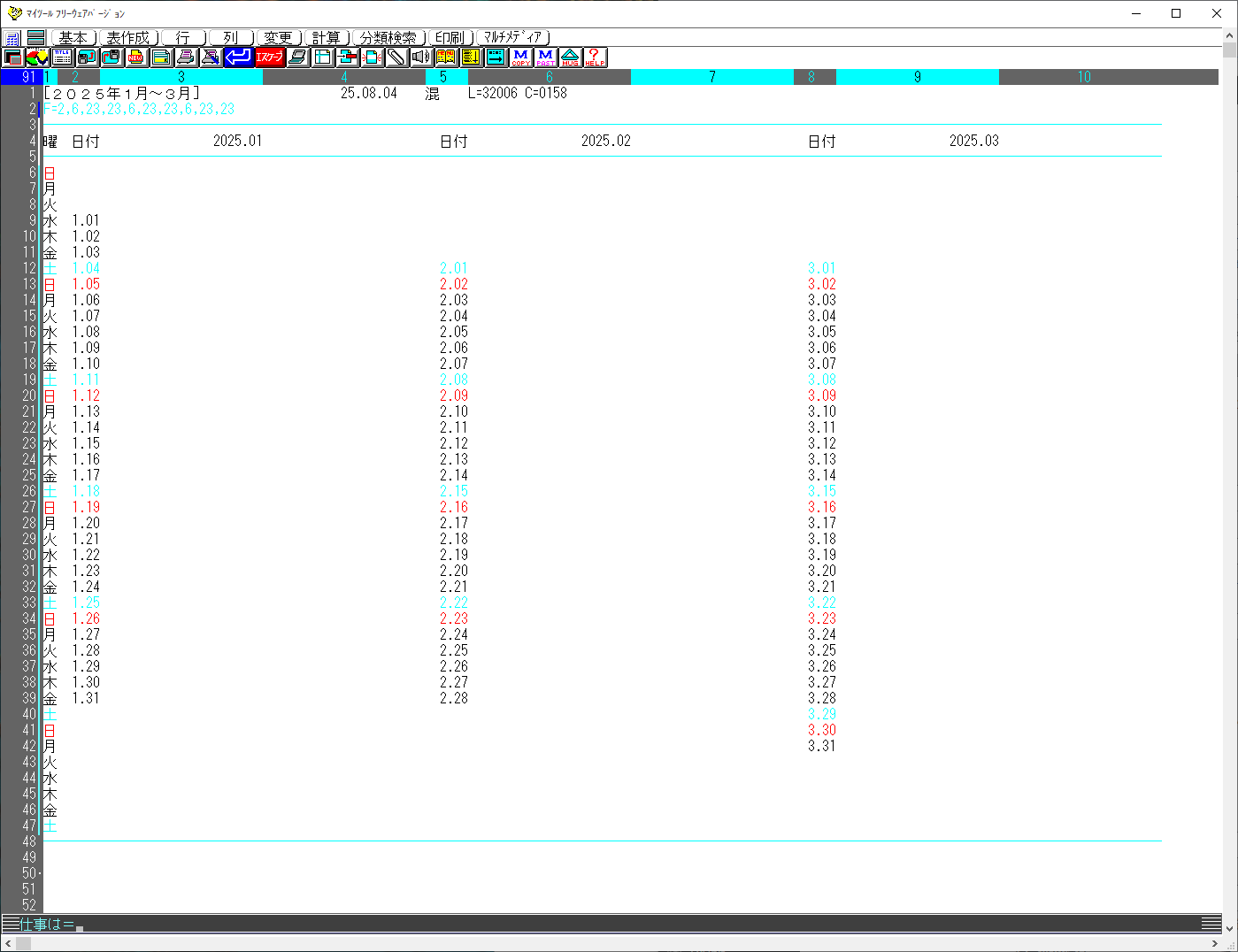 オートプログラム「YEAR」ドン実行後の曜日優先カレンダー