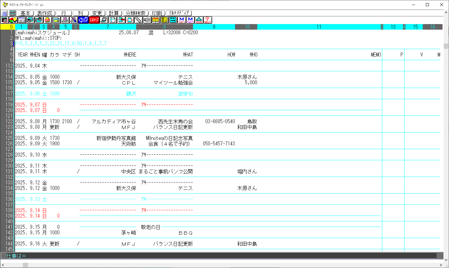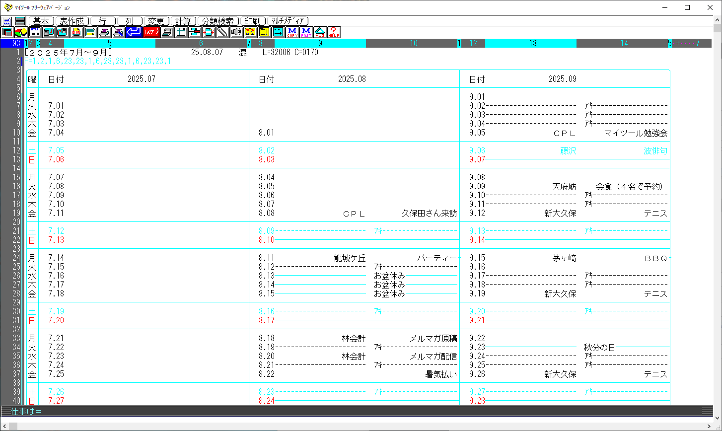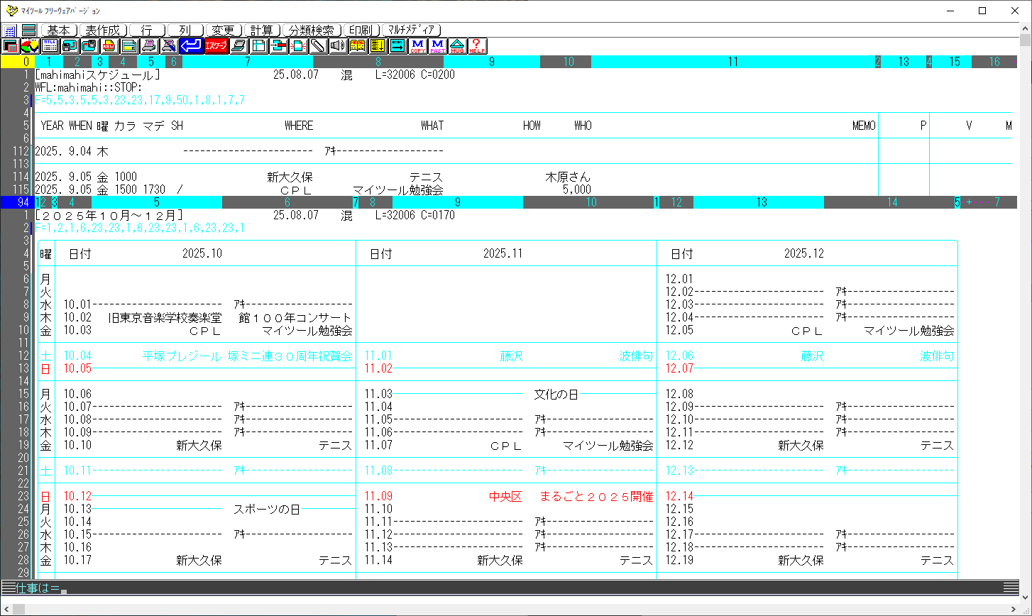 スケジュール管理のデータ(7列めと8列)がちゃんと曜日優先カレンダーの列(5,6列、9,10列、13,14列の列)に収まりました。